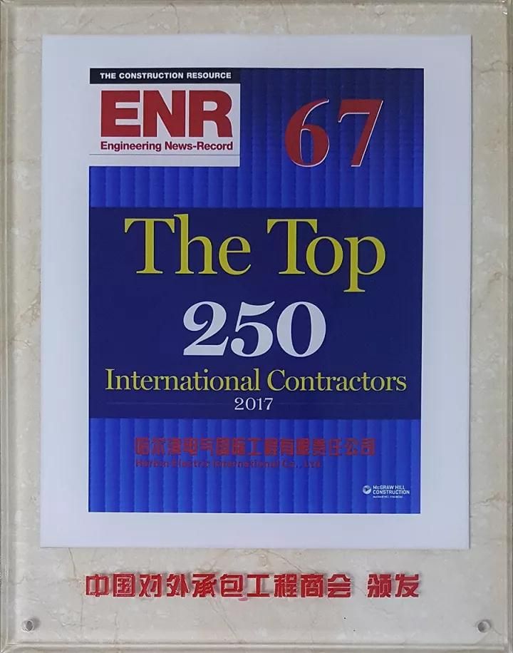 會(huì)上,中國(guó)對(duì)外承包工程商會(huì)為入選“2017年度ENR全球最大250家國(guó)際承包商”的中國(guó)企業(yè)頒牌。哈電國(guó)際2017年再次榮膺ENR全球最大250家國(guó)際承包商百?gòu)?qiáng)榜單,排名晉升至第67位,比2016年排名提升了21位,在入選ENR的中國(guó)企業(yè)中排名第13位。