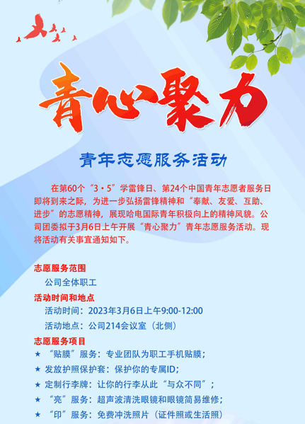 今年是毛澤東等老一輩革命家為雷鋒同志題詞60周年。近日,習(xí)近平總書記對深入開展學(xué)雷鋒活動作出重要指示,充分肯定60年來學(xué)雷鋒活動的顯著成效,深刻闡明雷鋒精神的永恒價值,對新征程上更好弘揚雷鋒精神提出明確要求。為進一步弘揚雷鋒精神和“奉獻、友愛、互助、進步”的志愿精神,在第 60 個“3·5”學(xué)雷鋒日、第24個中國青年志愿者服務(wù)日到來之際,哈電國際黨委專題研究部署,策劃組織多個志愿服務(wù)活動,展現(xiàn)了哈電國際青年積極向上的精神風(fēng)貌。 3月4日,哈電國際領(lǐng)導(dǎo)班子跟進學(xué)習(xí)習(xí)近平對深入開展學(xué)雷鋒活動作出的重要指示精神,印發(fā)《關(guān)于貫徹落實習(xí)近平總書記重要指示精神深入開展學(xué)雷鋒活動的通知》,對公司學(xué)雷鋒活動工作進行了全面研究部署。 3月3日,哈電國際工會和團委組織青年志愿服務(wù)隊帶著牙膏、香皂和洗發(fā)露等慰問品來到哈爾濱市特殊教育學(xué)校,為這里的孩子們送上一份溫暖,表達一份心意。老師們非常感動,他們感謝志愿者服務(wù)隊對孩子們的關(guān)愛和鼓勵,這讓他們感受到社會的溫暖和大愛。未來,哈電國際將與哈爾濱市特殊教育建立長期聯(lián)系,持續(xù)為學(xué)生們提供幫助,讓愛心之路越走越長。 3月6日,哈電國際團委開展“青心聚力”青年服務(wù)活動,組建志愿者服務(wù)隊,免費為公司全體職工提供手機貼膜服務(wù)、“亮”服務(wù)(清洗眼鏡及眼鏡簡易維修)、印”服務(wù)(打印照片),并為公出的職工發(fā)放護照套和行李牌。本次活動得到了公司廣大職工的積極參與,共計貼手機膜60余個、清洗、維修眼鏡20余副、打印照片20張、發(fā)放護照套100余個、行李牌150余個,活動反響熱烈,受到廣泛好評。 接下來,哈電國際各基層黨組織和群團組織將結(jié)合工作實際,積極組織本部門黨員、青年和職工群眾積極參與文明城市創(chuàng)建、社會義務(wù)服務(wù)、愛心助學(xué)助老等學(xué)雷鋒社會實踐活動,讓學(xué)雷鋒在公司廣大團員青年中蔚然成風(fēng),教育引導(dǎo)廣大青年爭做新時代雷鋒精神的傳承者、新時代雷鋒精神的踐行者和新時代雷鋒精神的發(fā)揚者。