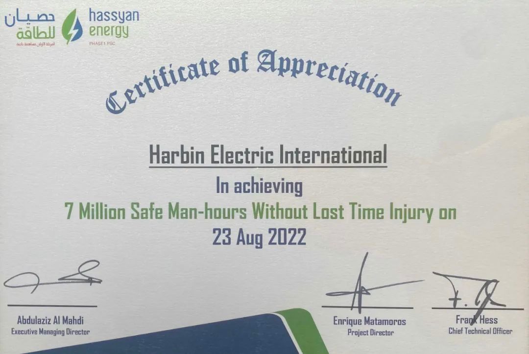 近日,哈電國際承建的迪拜哈斯彥電站項目現(xiàn)場施工實現(xiàn)700萬安全人工時的安全績效。哈斯彥項目執(zhí)行經(jīng)理Mohammad Abunayyan為哈電國際哈斯彥項目部頒發(fā)了安全管理榮譽(yù)證書。 自2021年10月份以來,哈電國際現(xiàn)場施工團(tuán)隊與安全團(tuán)隊緊密配合,克服項目現(xiàn)場不利條件,始終秉持“以人為本,安全第一”的安全理念,充分重視項目建設(shè)的安全、環(huán)境管理工作,加強(qiáng)安全監(jiān)督管理,制定并嚴(yán)格執(zhí)行現(xiàn)場安全生產(chǎn)管理規(guī)定,在完成3、4號機(jī)多個重大節(jié)點的同時,確?,F(xiàn)場不發(fā)生重大安全事故、重大環(huán)境事故發(fā)生,取得了700萬安全人工時的佳績,為后續(xù)3、4號機(jī)組的順利推進(jìn)奠定了良好的基礎(chǔ)。 目前哈斯彥電站項目1、2號機(jī)組已進(jìn)入商業(yè)運(yùn)行;3號機(jī)組已實現(xiàn)雙燃料滿負(fù)荷發(fā)電,正在進(jìn)行商業(yè)運(yùn)行前的見證試驗;4號機(jī)組正處于施工調(diào)試高峰期,鍋爐水壓試驗、機(jī)組倒送電、凝汽器灌水試驗等重大節(jié)點已完成,機(jī)組調(diào)試工作正在逐步展開。哈電國際哈斯彥項目團(tuán)隊將一如既往在保障現(xiàn)場人員健康安全作業(yè)的同時,全力保證項目執(zhí)行進(jìn)展,確保項目后續(xù)各項節(jié)點順利實現(xiàn)。
