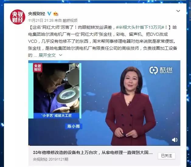 “央視財經”微博全文如下: 【這名“網紅大師”厲害了!肉眼能辨發(fā)絲誤差,#半根大頭針省下13萬元#!】哈電集團哈爾濱電機廠有一位“網紅大師”張金柱,彩電、留聲機、把DVD改成VCD,幾乎沒有他修不了的東西,周末幫同事修理電器對他來說就是家常便飯。張金柱,是哈電集團哈爾濱電機廠有限責任公司的高級技師,負責線圈加工設備的維修和改造。2015年,廠里唯一一臺法國進口的成型機突然無法工作。當時,這臺設備正在負責生產國家“西電東送”的重點項目。廠里找了國外工程師遠程“會診”,被要求更換一條價值13萬元的進口電纜。張金柱不服氣了,對著電纜插頭里14根細如小號縫衣針的銅線,連續(xù)盯了七八天,終于發(fā)現,其中一根比其他13根短了一點點:這距離相當于一根頭發(fā)絲的直徑。他大膽將半根大頭針焊接在這根銅線上,設備終于恢復運轉。 從一名學徒工,到如今的電氣行業(yè)專家、高級技師,張金柱靠著幾十年如一日孜孜不倦的鉆研、專注與堅守,成為了“智能制造電機心臟”的大工匠,被評為全國技術能手、全國五一勞模,拿到了多項國家專利?!督洕胄r》為您講述!