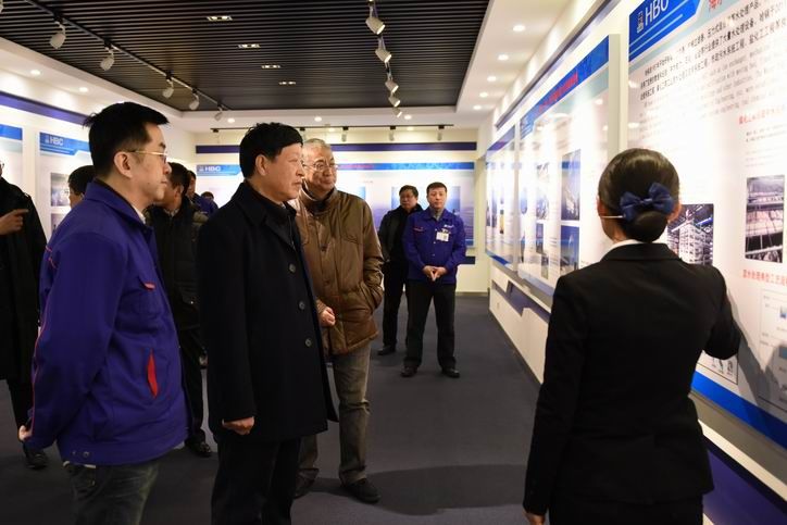 圖為國(guó)家工信部紀(jì)檢組長(zhǎng)金書波(左二)在集團(tuán)公司副總經(jīng)理苗立杰(左三)的陪同下視察鍋爐公司