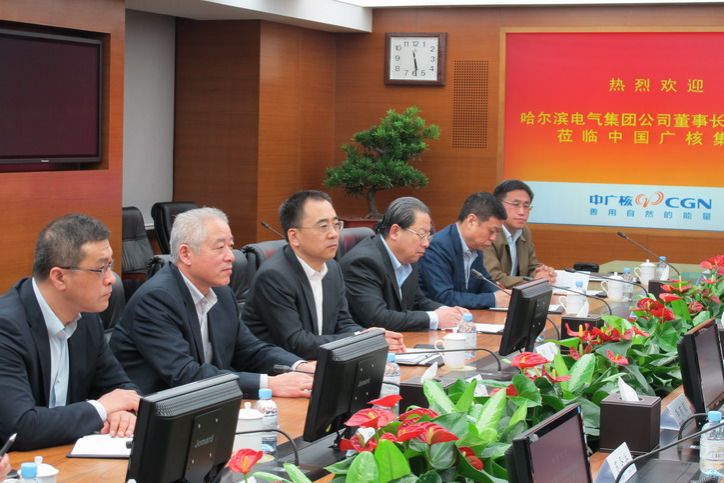 圖為哈電集團(tuán)董事長(zhǎng)、黨委書(shū)記鄒磊(左三)等一行在中國(guó)廣核集團(tuán)與客戶親切溝通交流