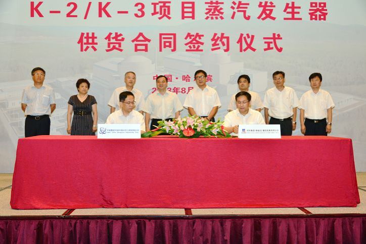 中核集團(tuán)K-2、K-3項(xiàng)目蒸汽發(fā)生器是哈電集團(tuán)繼C2、C3和C4項(xiàng)目后與中核集團(tuán)中原對(duì)外工程有限公司的又一次合作,該項(xiàng)目采用中國(guó)ACP1000自主三代核電技術(shù), K-2/K-3項(xiàng)目也將是中國(guó)百萬(wàn)千瓦等級(jí)核電機(jī)組首個(gè)出口項(xiàng)目。本合同的簽訂充分體現(xiàn)了中核集團(tuán)對(duì)哈電集團(tuán)的信任和支持。中核集團(tuán)總經(jīng)理助理李曉明在致辭中高度評(píng)價(jià)了雙方長(zhǎng)期以來(lái)的合作,并對(duì)哈電集團(tuán)提出了新的希望和要求。吳偉章在致辭中表示將嚴(yán)格履行合同,制造出中國(guó)核電出口項(xiàng)目的精品,向中核集團(tuán)交出一份滿意的答卷。