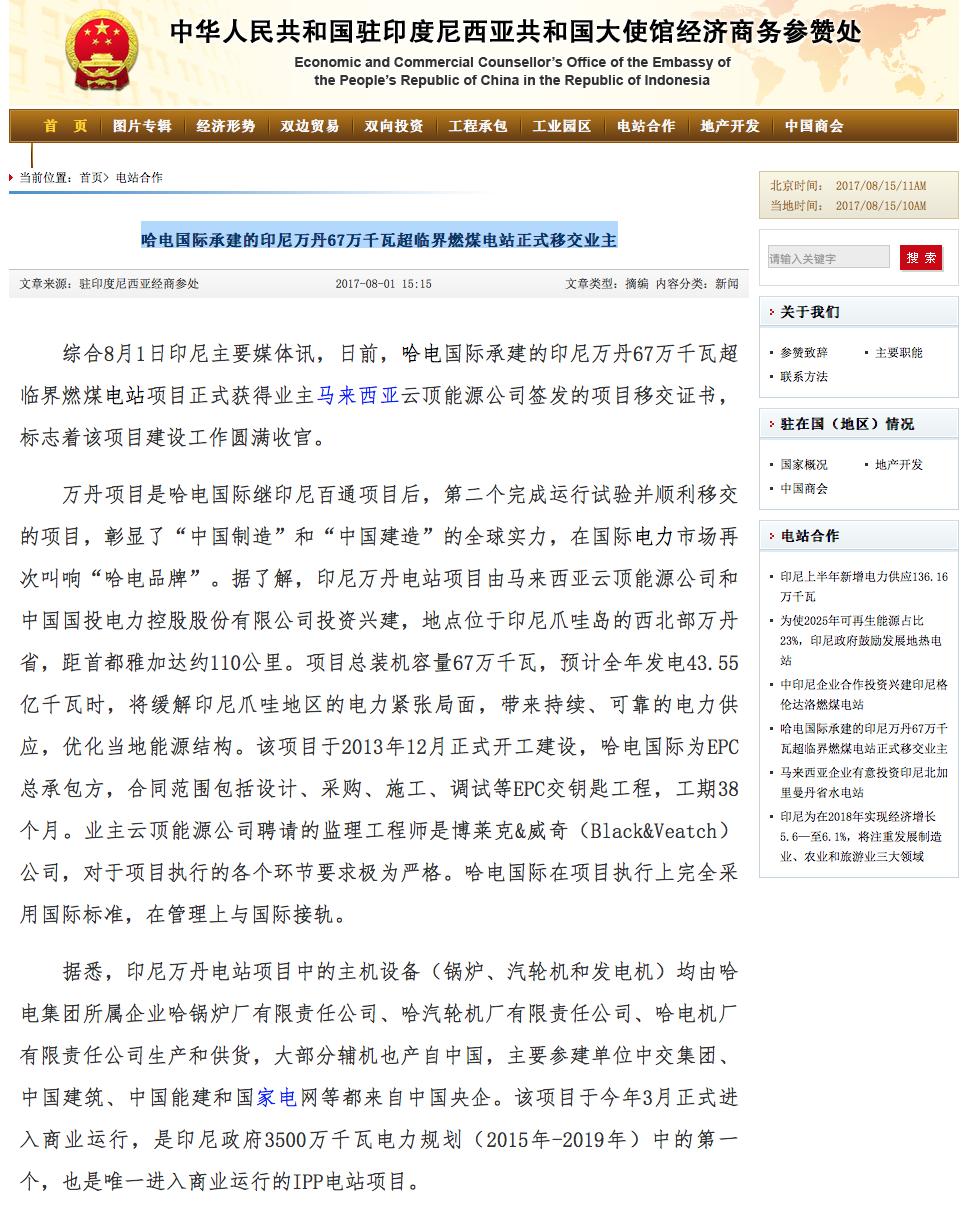 綜合8月1日印尼主要媒體訊,日前,哈電國際承建的印尼萬丹67萬千瓦超臨界燃煤電站項目正式獲得業(yè)主馬來西亞云頂能源公司簽發(fā)的項目移交證書,標(biāo)志著該項目建設(shè)工作圓滿收官。 萬丹項目是哈電國際繼印尼百通項目后,第二個完成運行試驗并順利移交的項目,彰顯了“中國制造”和“中國建造”的全球?qū)嵙?,在國際電力市場再次叫響“哈電品牌”。據(jù)了解,印尼萬丹電站項目由馬來西亞云頂能源公司和中國國投電力控股股份有限公司投資興建,地點位于印尼爪哇島的西北部萬丹省,距首都雅加達(dá)約110公里。項目總裝機容量67萬千瓦,預(yù)計全年發(fā)電43.55億千瓦時,將緩解印尼爪哇地區(qū)的電力緊張局面,帶來持續(xù)、可靠的電力供應(yīng),優(yōu)化當(dāng)?shù)啬茉唇Y(jié)構(gòu)。該項目于2013年12月正式開工建設(shè),哈電國際為EPC總承包方,合同范圍包括設(shè)計、采購、施工、調(diào)試等EPC交鑰匙工程,工期38個月。業(yè)主云頂能源公司聘請的監(jiān)理工程師是博萊克&威奇(Black&Veatch)公司,對于項目執(zhí)行的各個環(huán)節(jié)要求極為嚴(yán)格。哈電國際在項目執(zhí)行上完全采用國際標(biāo)準(zhǔn),在管理上與國際接軌。 據(jù)悉,印尼萬丹電站項目中的主機設(shè)備(鍋爐、汽輪機和發(fā)電機)均由哈電集團(tuán)所屬企業(yè)哈鍋爐廠有限責(zé)任公司、哈汽輪機廠有限責(zé)任公司、哈電機廠有限責(zé)任公司生產(chǎn)和供貨,大部分輔機也產(chǎn)自中國,主要參建單位中交集團(tuán)、中國建筑、中國能建和國家電網(wǎng)等都來自中國央企。該項目于今年3月正式進(jìn)入商業(yè)運行,是印尼政府3500萬千瓦電力規(guī)劃(2015年-2019年)中的第一個,也是唯一進(jìn)入商業(yè)運行的IPP電站項目。 |