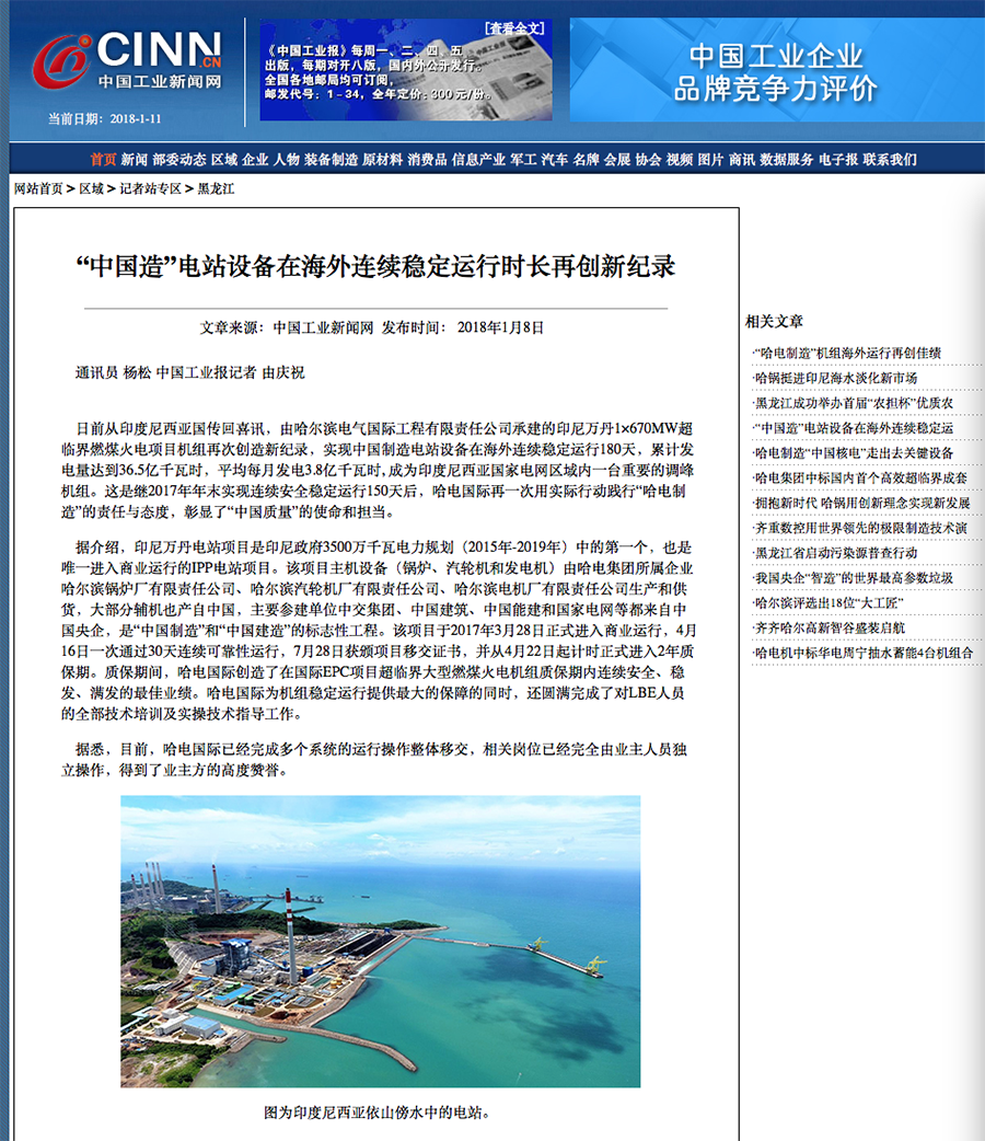 日前從印度尼西亞國傳回喜訊,由哈爾濱電氣國際工程有限責(zé)任公司承建的印尼萬丹1×670MW超臨界燃煤火電項目機組再次創(chuàng)造新紀錄,實現(xiàn)中國制造電站設(shè)備在海外連續(xù)穩(wěn)定運行180天,累計發(fā)電量達到36.5億千瓦時,平均每月發(fā)電3.8億千瓦時, 成為印度尼西亞國家電網(wǎng)區(qū)域內(nèi)一臺重要的調(diào)峰機組。這是繼2017年年末實現(xiàn)連續(xù)安全穩(wěn)定運行150天后,哈電國際再一次用實際行動踐行“哈電制造”的責(zé)任與態(tài)度,彰顯了“中國質(zhì)量”的使命和擔(dān)當(dāng)。 據(jù)介紹,印尼萬丹電站項目是印尼政府3500萬千瓦電力規(guī)劃(2015年-2019年)中的第一個,也是唯一進入商業(yè)運行的IPP電站項目。該項目主機設(shè)備(鍋爐、汽輪機和發(fā)電機)由哈電集團所屬企業(yè)哈爾濱鍋爐廠有限責(zé)任公司、哈爾濱汽輪機廠有限責(zé)任公司、哈爾濱電機廠有限責(zé)任公司生產(chǎn)和供貨,大部分輔機也產(chǎn)自中國,主要參建單位中交集團、中國建筑、中國能建和國家電網(wǎng)等都來自中國央企,是“中國制造”和“中國建造”的標志性工程。該項目于2017年3月28日正式進入商業(yè)運行,4月16日一次通過30天連續(xù)可靠性運行,7月28日獲頒項目移交證書,并從4月22日起計時正式進入2年質(zhì)保期。質(zhì)保期間,哈電國際創(chuàng)造了在國際EPC項目超臨界大型燃煤火電機組質(zhì)保期內(nèi)連續(xù)安全、穩(wěn)發(fā)、滿發(fā)的最佳業(yè)績。哈電國際為機組穩(wěn)定運行提供最大的保障的同時,還圓滿完成了對LBE人員的全部技術(shù)培訓(xùn)及實操技術(shù)指導(dǎo)工作。 據(jù)悉,目前,哈電國際已經(jīng)完成多個系統(tǒng)的運行操作整體移交,相關(guān)崗位已經(jīng)完全由業(yè)主人員獨立操作,得到了業(yè)主方的高度贊譽。 |