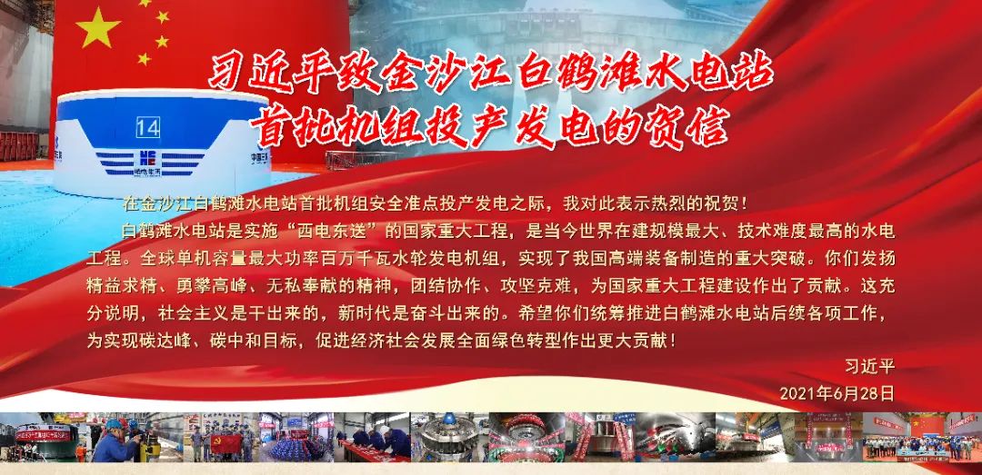 2021年6月28日,金沙江白鶴灘水電站首批機組投產(chǎn)發(fā)電,中共中央總書記、國家主席、中央軍委主席習近平致信祝賀,寄語廣大項目建設(shè)者——統(tǒng)籌推進白鶴灘水電站后續(xù)各項工作,為實現(xiàn)碳達峰、碳中和目標,促進經(jīng)濟社會發(fā)展全面綠色轉(zhuǎn)型作出更大貢獻!